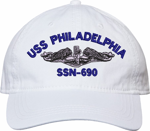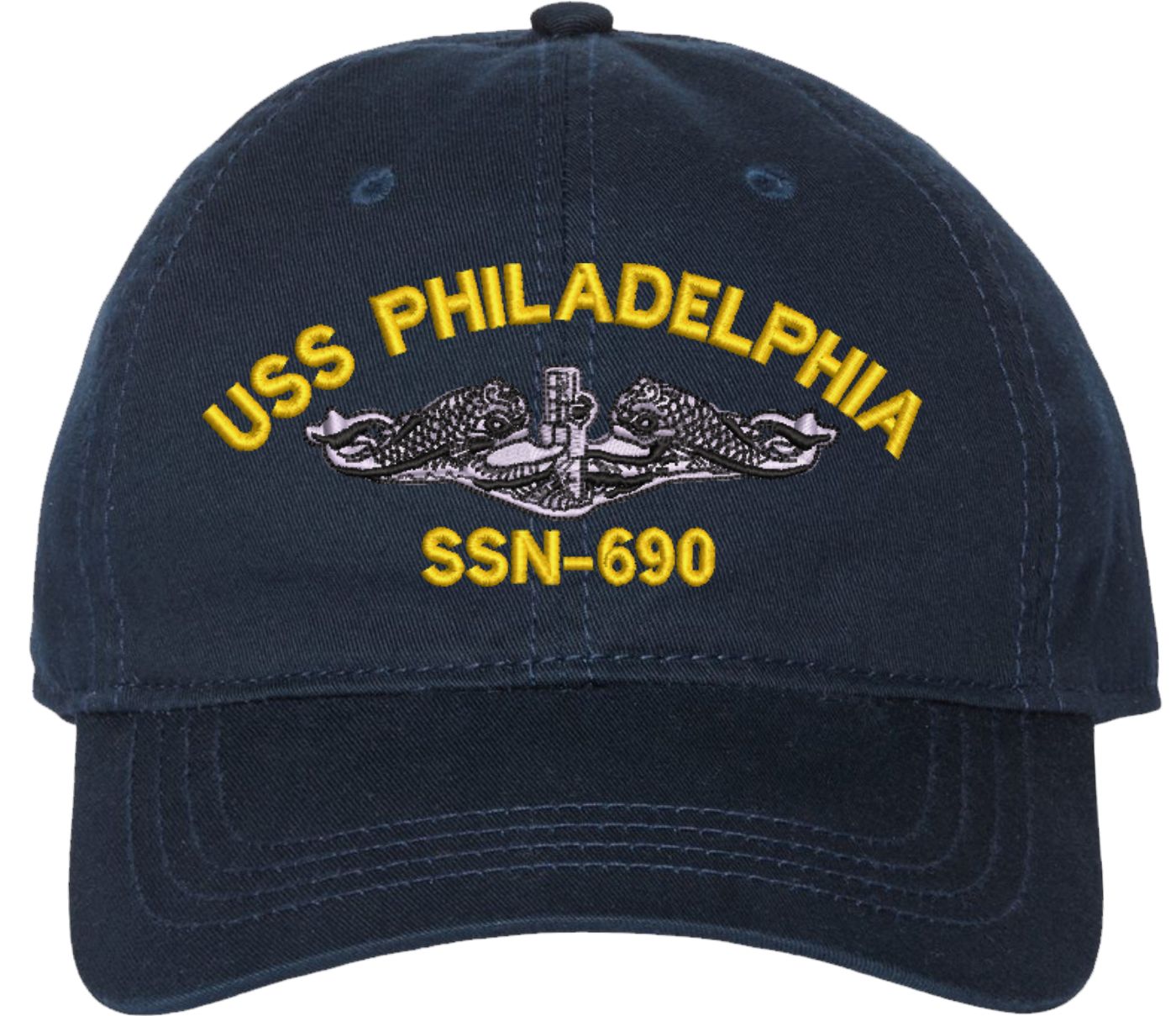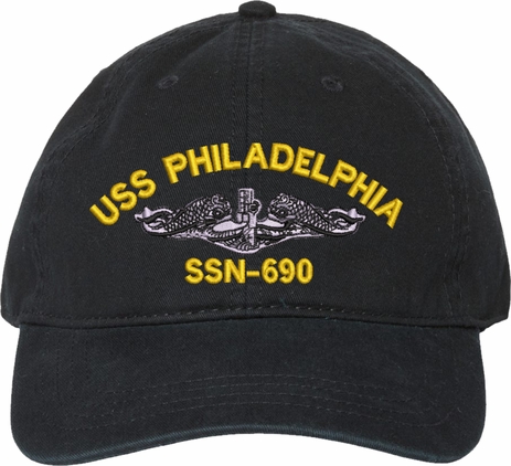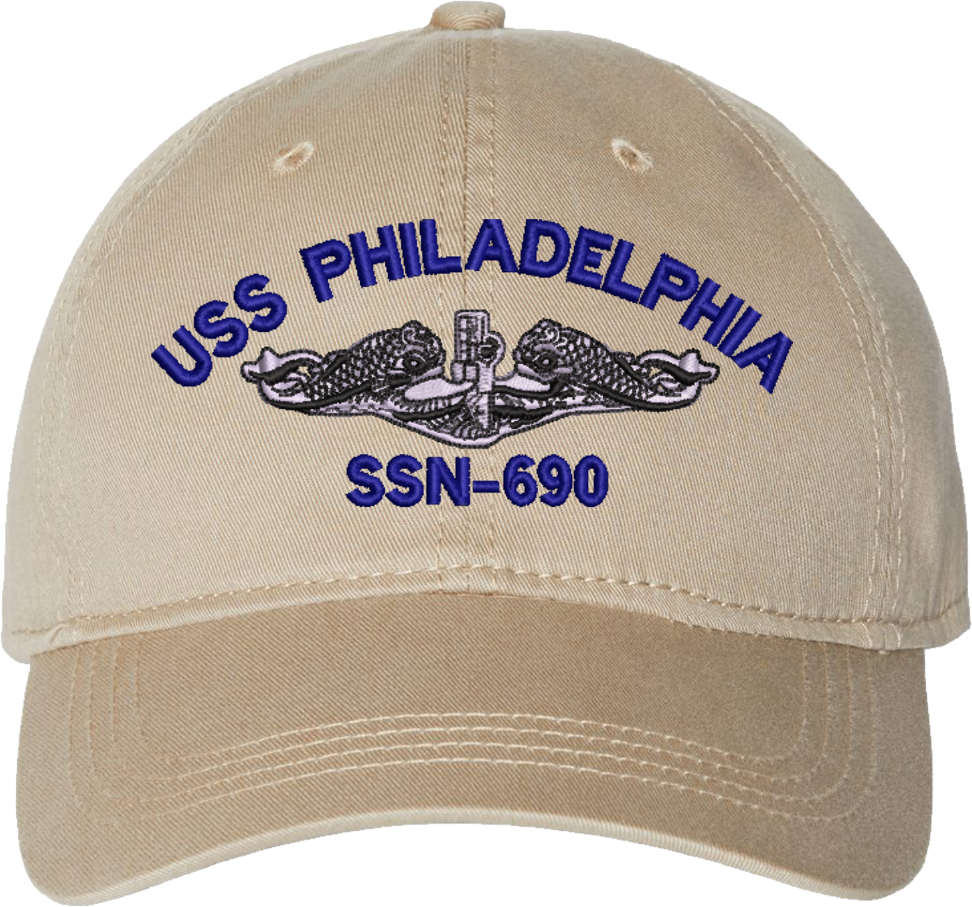 Show your Navy pride with this USS Philadelphia SSN-690 with Dolphins Unstructured Dad Cap from MilitaryBest. Crafted from 100% washed chino twill cotton, this six-panel, low-profile cap offers a relaxed and comfortable fit. Featuring high-quality embroidery done in our Scottsboro, Alabama facility, this cap is designed with a pre-curved visor and an adjustable tri-glide buckle closure for a perfect fit. Whether for everyday wear or as a meaningful gift, this cap is a great way to honor your own or a loved one's service.For caps ordered with custom embroidered personalized text please allow an additional 3 to 5 days production time. All custom back text will be embroidered in ALL CAPITAL LETTERS. Caps with back text or eggs are non-returnable unless there is a material defect in the cap.