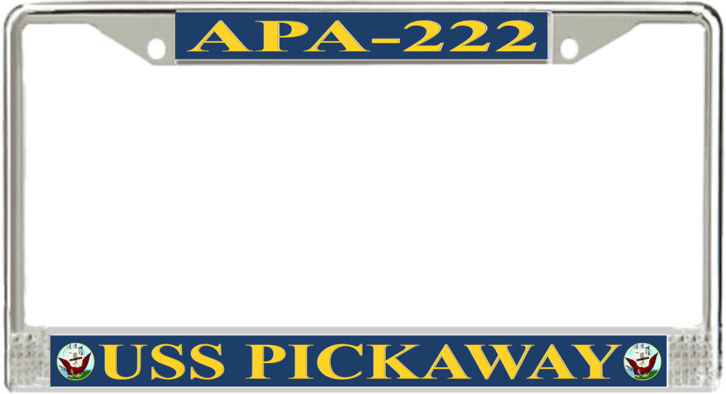 USS Pickaway APA-222 License Plate FrameThis USS Pickaway APA-222 License Plate Frame is proudly made in the USA at our facilities in Scottsboro, Alabama. Each of our MilitaryBest U.S. Navy Frames feature top and bottom Poly Coated Aluminum strips that are printed using sublimation which gives these quality automobile military frames a beautiful high gloss finish.