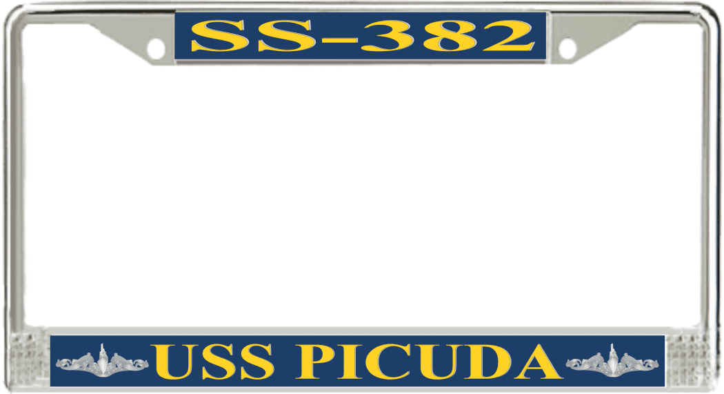 USS Picuda SS-382 License Plate Frame This USS Picuda SS-382 License Plate Frame is proudly made in the USA at our facilities in Scottsboro, Alabama. Each Frame features top and bottom sublimated design strips that are poly coated for a protective gloss finish. Please check your state and local regulations for compatibility of these frames for use on your vehicle.