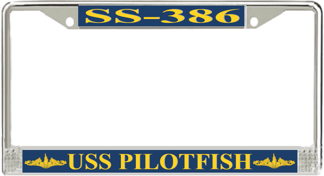 USS Pilotfish SS-386 License Plate Frame This USS Pilotfish SS-386 License Plate Frame is proudly made in the USA at our facilities in Scottsboro, Alabama. Each Frame features top and bottom sublimated design strips that are poly coated for a protective gloss finish. Please check your state and local regulations for compatibility of these frames for use on your vehicle.
