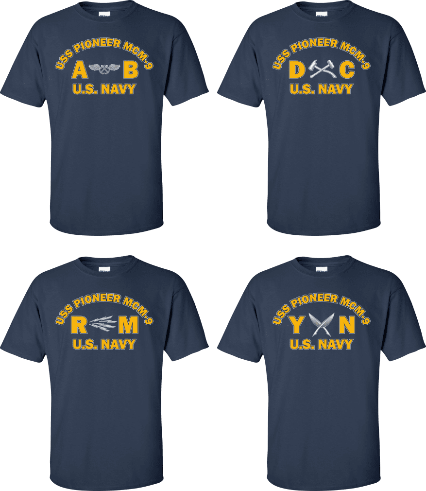 Due to disruptions in supply chains, this design will be embroidered on a Champion, Gildan, Jerzees or comparable brand.Proudly display your ship and rate with our top quality USS PIONEER MCM-9 Rates t-shirts, sweatshirts, and hoodies. These fine U.S. Navy apparel items will make you the envy of your veteran buddies, or will make a fine gift! Our USS PIONEER MCM-9 shirts are proudly printed in the USA!