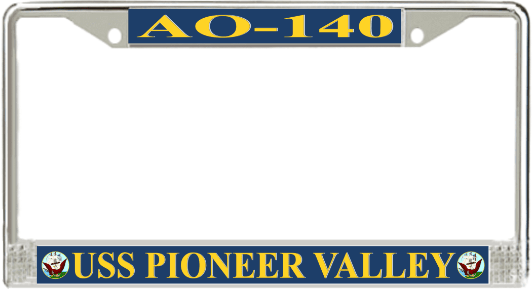 USS Pioneer Valley AO-140 License Plate FrameThis USS Pioneer Valley AO-140 License Plate Frame is proudly made in the USA at our facilities in Scottsboro, Alabama. Each of our MilitaryBest U.S. Navy Frames feature top and bottom Poly Coated Aluminum strips that are printed using sublimation which gives these quality automobile military frames a beautiful high gloss finish.