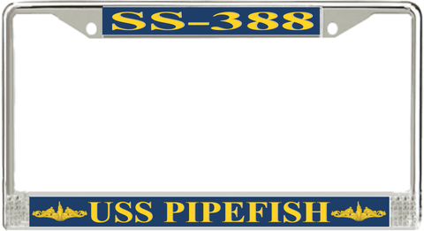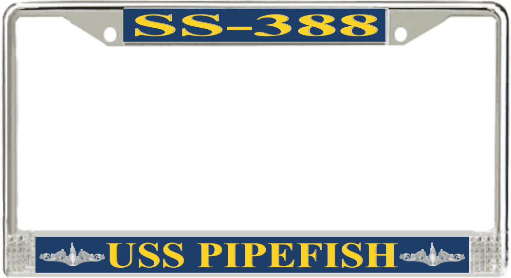 USS Pipefish SS-388 License Plate Frame This USS Pipefish SS-388 License Plate Frame is proudly made in the USA at our facilities in Scottsboro, Alabama. Each Frame features top and bottom sublimated design strips that are poly coated for a protective gloss finish. Please check your state and local regulations for compatibility of these frames for use on your vehicle.