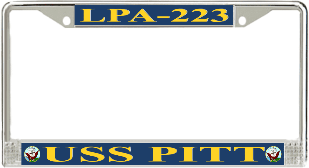 USS Pitt LPA-223 License Plate frameThis USS Pitt LPA-223 License Plate frame is proudly made in the USA at our facilities in Scottsboro, Alabama. Each of our MilitaryBest U.S. Navy Frames feature top and bottom Poly Coated Aluminum strips that are printed using sublimation which gives these quality automobile military frames a beautiful high gloss finish.