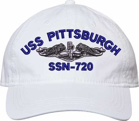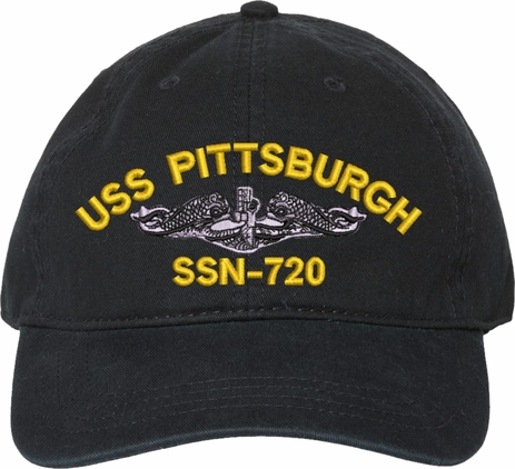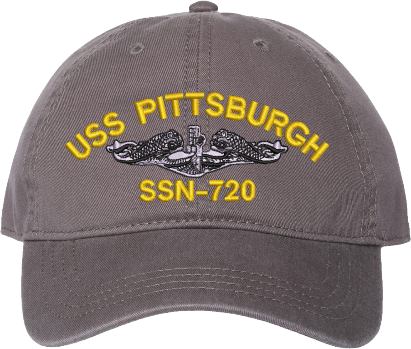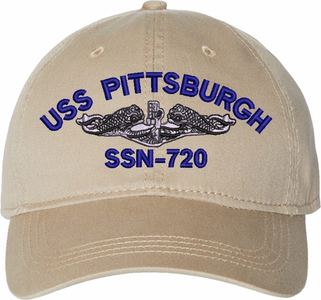 Show your Navy pride with this USS Pittsburgh SSN-720 with Dolphins Unstructured Dad Cap from MilitaryBest. Crafted from 100% washed chino twill cotton, this six-panel, low-profile cap offers a relaxed and comfortable fit. Featuring high-quality embroidery done in our Scottsboro, Alabama facility, this cap is designed with a pre-curved visor and an adjustable tri-glide buckle closure for a perfect fit. Whether for everyday wear or as a meaningful gift, this cap is a great way to honor your own or a loved one's service.For caps ordered with custom embroidered personalized text please allow an additional 3 to 5 days production time. All custom back text will be embroidered in ALL CAPITAL LETTERS. Caps with back text or eggs are non-returnable unless there is a material defect in the cap.