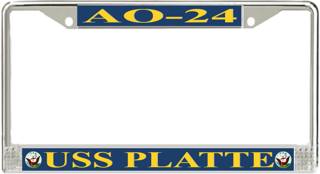 USS Platte AO-24 License Plate FrameThis USS Platte AO-24 License Plate Frame is proudly made in the USA at our facilities in Scottsboro, Alabama. Each of our MilitaryBest U.S. Navy Frames feature top and bottom Poly Coated Aluminum strips that are printed using sublimation which gives these quality automobile military frames a beautiful high gloss finish.