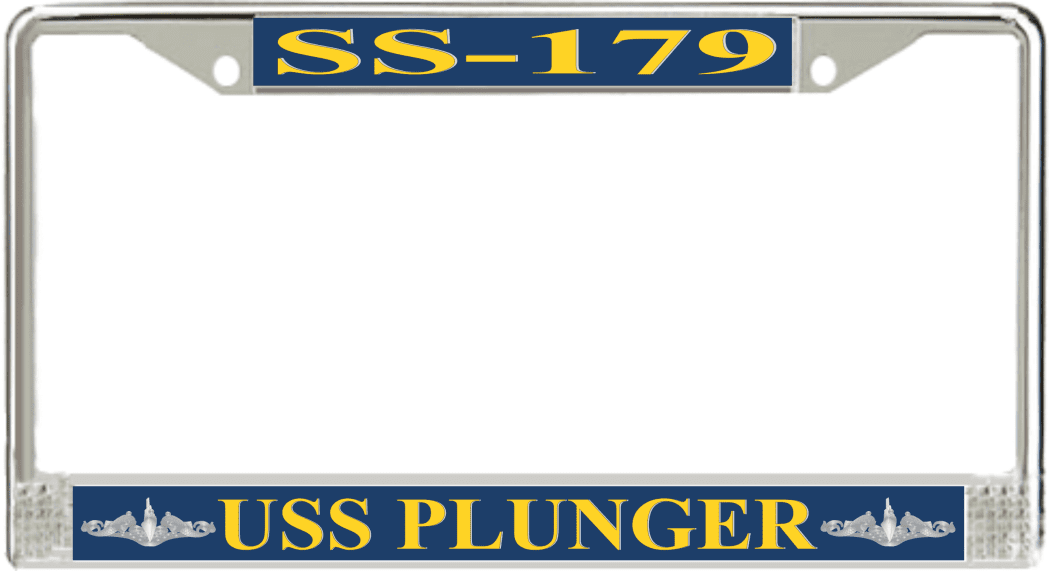 USS Plunger SS-179 License Plate Frame This USS Plunger SS-179 License Plate Frame is proudly made in the USA at our facilities in Scottsboro, Alabama. Each Frame features top and bottom sublimated design strips that are poly coated for a protective gloss finish. Please check your state and local regulations for compatibility of these frames for use on your vehicle.