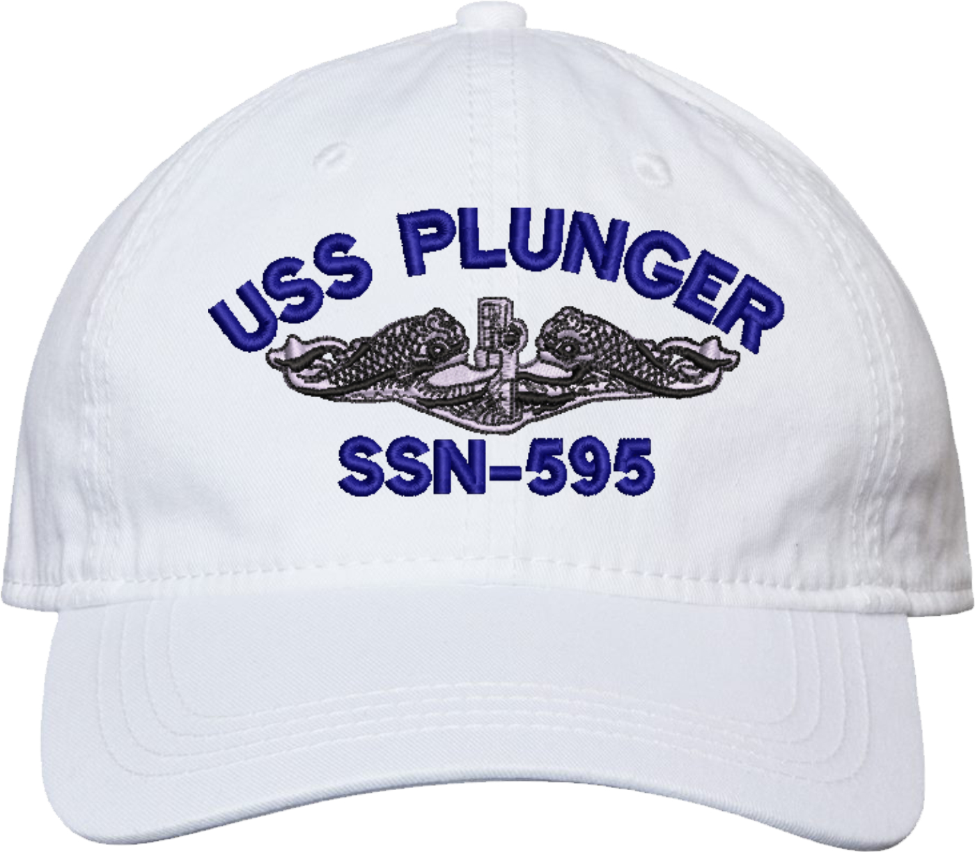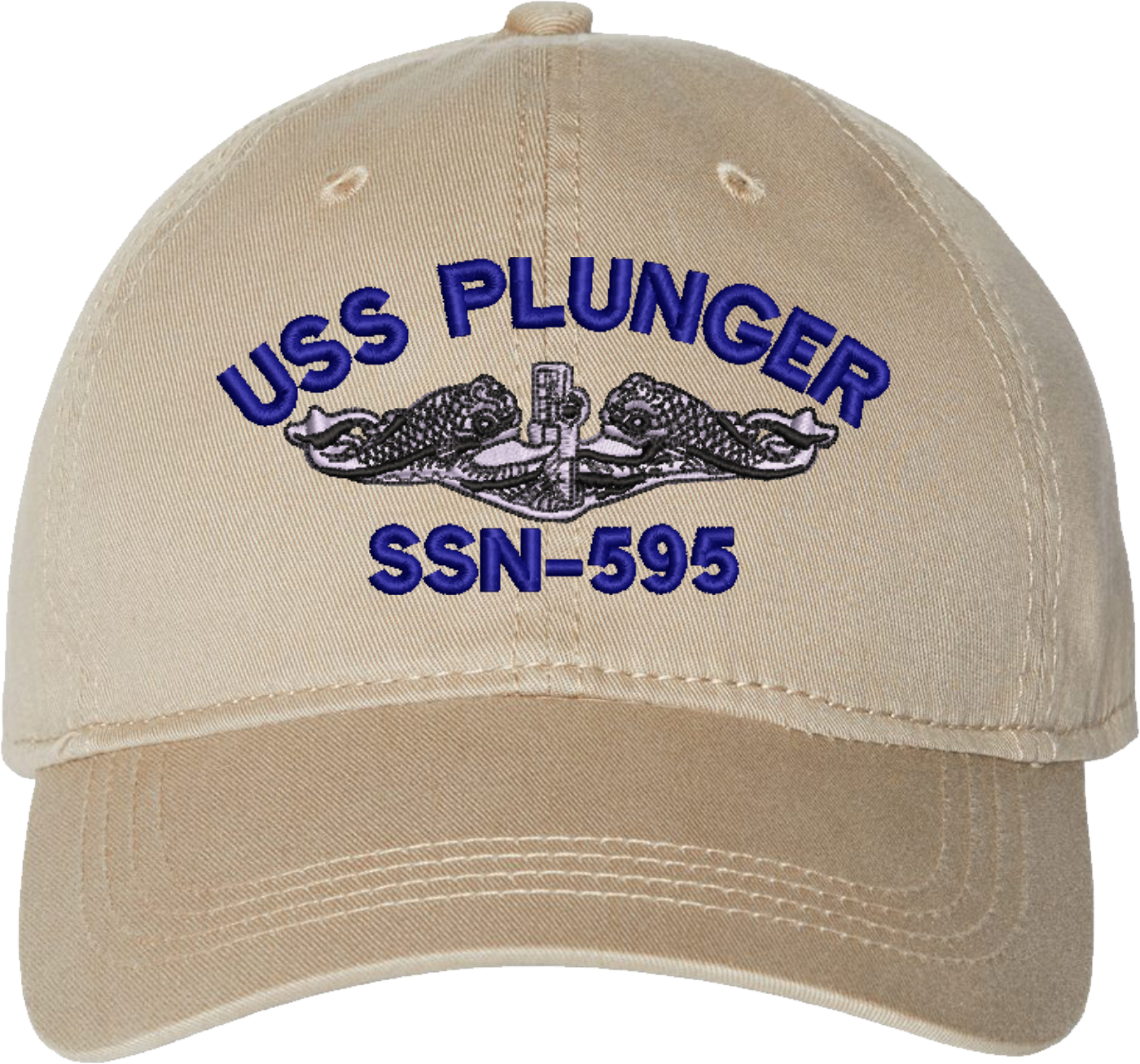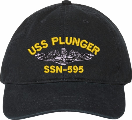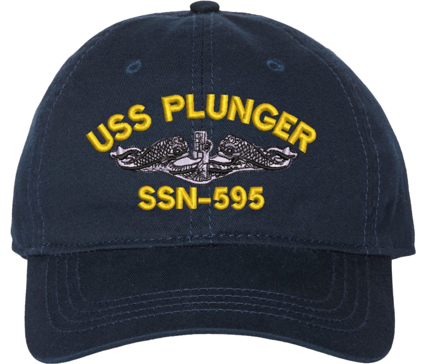 Show your Navy pride with this USS Plunger SSN-595 with Dolphins Unstructured Dad Cap from MilitaryBest. Crafted from 100% washed chino twill cotton, this six-panel, low-profile cap offers a relaxed and comfortable fit. Featuring high-quality embroidery done in our Scottsboro, Alabama facility, this cap is designed with a pre-curved visor and an adjustable tri-glide buckle closure for a perfect fit. Whether for everyday wear or as a meaningful gift, this cap is a great way to honor your own or a loved one's service.For caps ordered with custom embroidered personalized text please allow an additional 3 to 5 days production time. All custom back text will be embroidered in ALL CAPITAL LETTERS. Caps with back text or eggs are non-returnable unless there is a material defect in the cap.