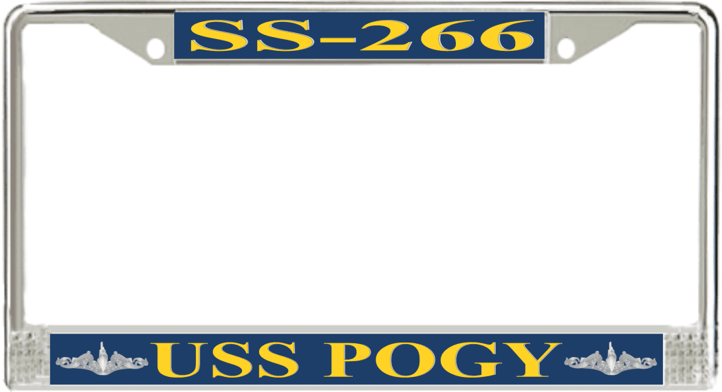USS Pogy SS-266 License Plate Frame This USS Pogy SS-266 License Plate Frame is proudly made in the USA at our facilities in Scottsboro, Alabama. Each Frame features top and bottom sublimated design strips that are poly coated for a protective gloss finish. Please check your state and local regulations for compatibility of these frames for use on your vehicle.