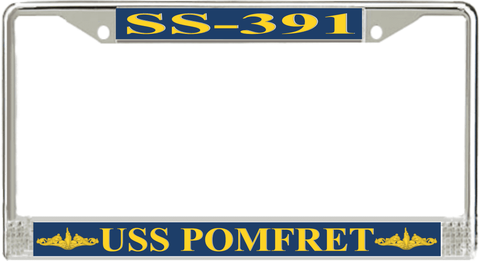 USS Pomfret SS-391 License Plate Frame This USS Pomfret SS-391 License Plate Frame is proudly made in the USA at our facilities in Scottsboro, Alabama. Each Frame features top and bottom sublimated design strips that are poly coated for a protective gloss finish. Please check your state and local regulations for compatibility of these frames for use on your vehicle.