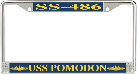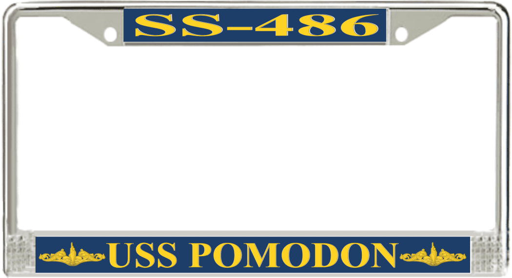 USS Pomodon SS-486 License Plate Frame This USS Pomodon SS-486 License Plate Frame is proudly made in the USA at our facilities in Scottsboro, Alabama. Each Frame features top and bottom sublimated design strips that are poly coated for a protective gloss finish. Please check your state and local regulations for compatibility of these frames for use on your vehicle.