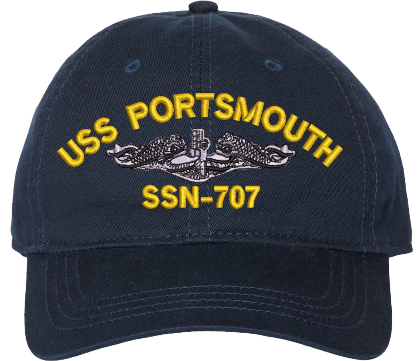 Show your Navy pride with this USS Portsmouth SSN-707 with Dolphins Unstructured Dad Cap from MilitaryBest. Crafted from 100% washed chino twill cotton, this six-panel, low-profile cap offers a relaxed and comfortable fit. Featuring high-quality embroidery done in our Scottsboro, Alabama facility, this cap is designed with a pre-curved visor and an adjustable tri-glide buckle closure for a perfect fit. Whether for everyday wear or as a meaningful gift, this cap is a great way to honor your own or a loved one's service.For caps ordered with custom embroidered personalized text please allow an additional 3 to 5 days production time. All custom back text will be embroidered in ALL CAPITAL LETTERS. Caps with back text or eggs are non-returnable unless there is a material defect in the cap.