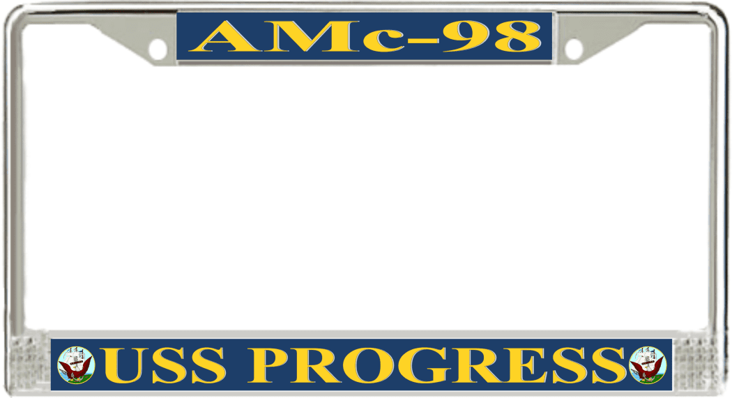 USS Progress AMc-98 License Plate FrameThis USS Progress AMc-98 License Plate Frame is proudly made in the USA at our facilities in Scottsboro, Alabama. Each of our MilitaryBest U.S. Navy Frames feature top and bottom Poly Coated Aluminum strips that are printed using sublimation which gives these quality automobile military frames a beautiful high gloss finish.