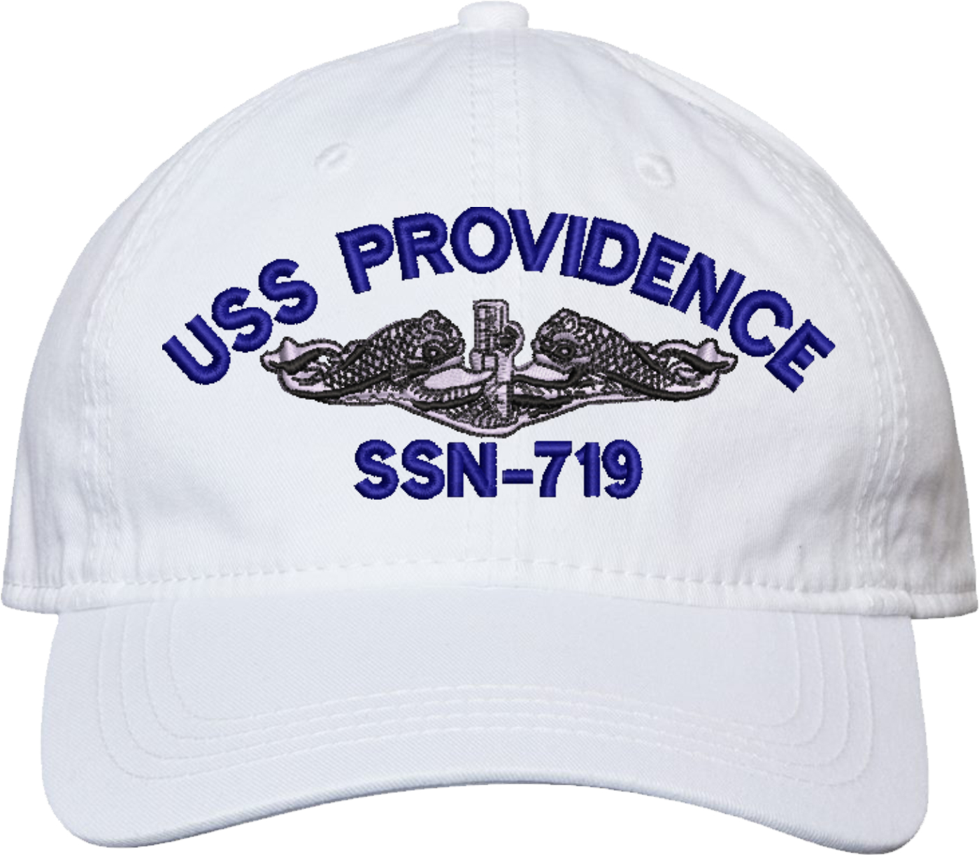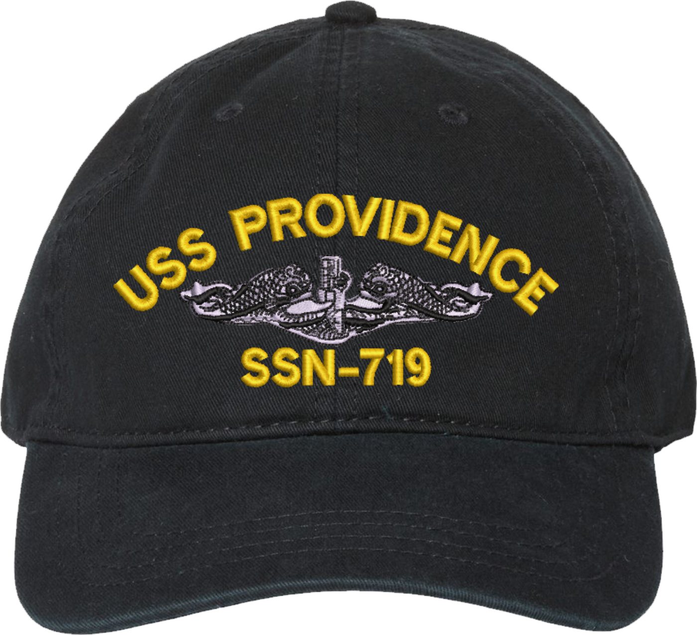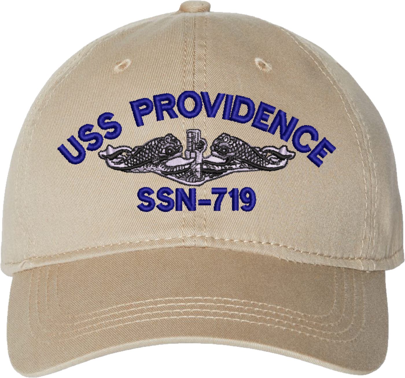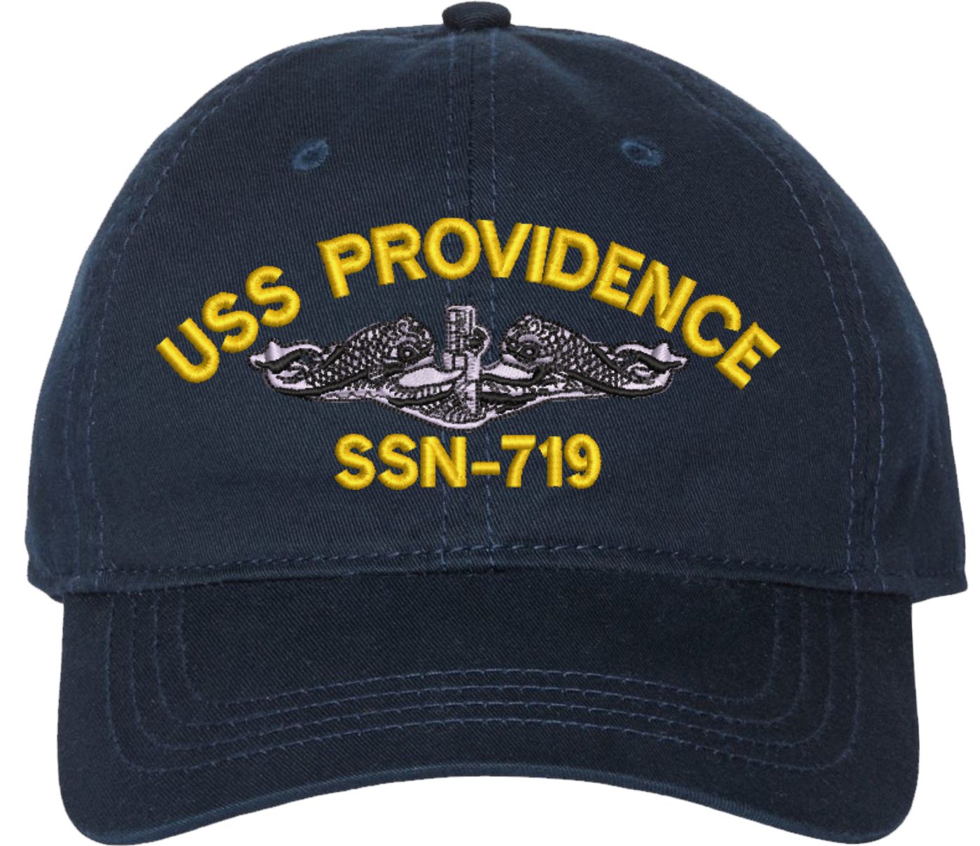 Show your Navy pride with this USS Providence SSN-719 with Dolphins Unstructured Dad Cap from MilitaryBest. Crafted from 100% washed chino twill cotton, this six-panel, low-profile cap offers a relaxed and comfortable fit. Featuring high-quality embroidery done in our Scottsboro, Alabama facility, this cap is designed with a pre-curved visor and an adjustable tri-glide buckle closure for a perfect fit. Whether for everyday wear or as a meaningful gift, this cap is a great way to honor your own or a loved one's service.For caps ordered with custom embroidered personalized text please allow an additional 3 to 5 days production time. All custom back text will be embroidered in ALL CAPITAL LETTERS. Caps with back text or eggs are non-returnable unless there is a material defect in the cap.