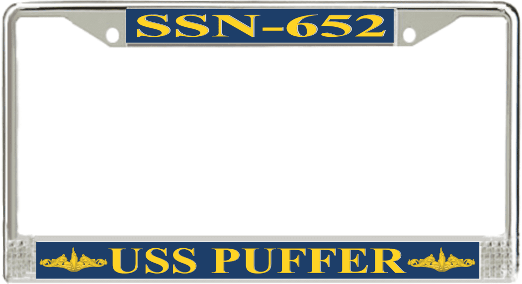 USS Puffer SSN-652 License Plate Frame This USS Puffer SSN-652 License Plate Frame is proudly made in the USA at our facilities in Scottsboro, Alabama. Each Frame features top and bottom sublimated design strips that are poly coated for a protective gloss finish. Please check your state and local regulations for compatibility of these frames for use on your vehicle.