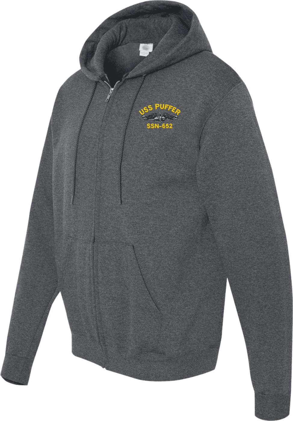 MilitaryBest has expanded its line of apparel with this custom embroidered USS Puffer SSN-652 with Dolphins Embroidered Zippered Hoodie. Each Hoodie is direct embroidered onto a Champion brand 9.5 oz 50/50 Cotton Poly blend. This will make an excellent addition to your wardrobe, or a great gift. Your satisfaction is Guaranteed! These quality zippered hoodies are proudly embroidered at our facilities in Scottsboro, AL. Support the Army MWR program by purchasing only from Licensed Vendors.