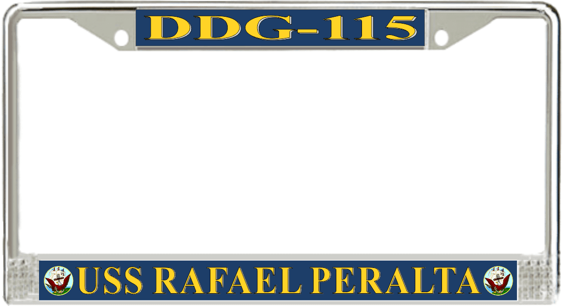 USS Rafael Peralta DDG-115 License Plate FrameThis USS Rafael Peralta DDG-115 License Plate Frame is proudly made in the USA at our facilities in Scottsboro, Alabama. Each of our MilitaryBest U.S. Navy Frames feature top and bottom Poly Coated Aluminum strips that are printed using sublimation which gives these quality automobile military frames a beautiful high gloss finish.