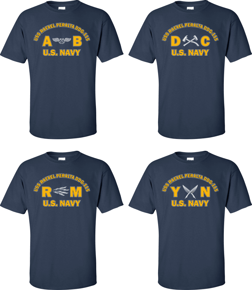 Due to disruptions in supply chains, this design will be embroidered on a Champion, Gildan, Jerzees or comparable brand.Proudly display your ship and rate with our top quality USS RAFAEL PERALTA DDG-115 Rates t-shirts, sweatshirts, and hoodies. These fine U.S. Navy apparel items will make you the envy of your veteran buddies, or will make a fine gift! Our USS RAFAEL PERALTA DDG-115 shirts are proudly printed in the USA!