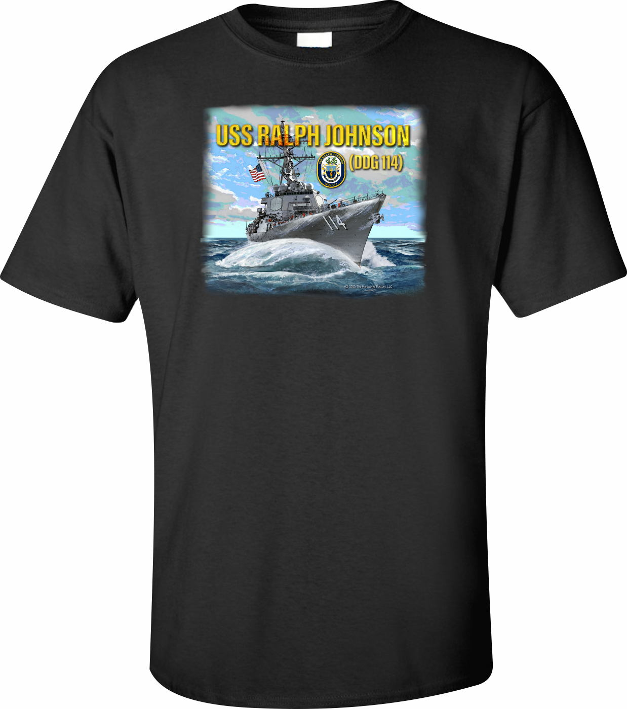 MilitaryBest is proud to offer this fine USS Ralph Johnson DDG-114 Printed Art T-Shirt. This shirt features a full front print, with beautiful artwork designed by licensed Navy artist David Hart. This shirt is available in black and navy blue colors. Each T-shirt is proudly printed in the USA.Unless there is a defect in workmanship or material, these shirts are unreturnable.