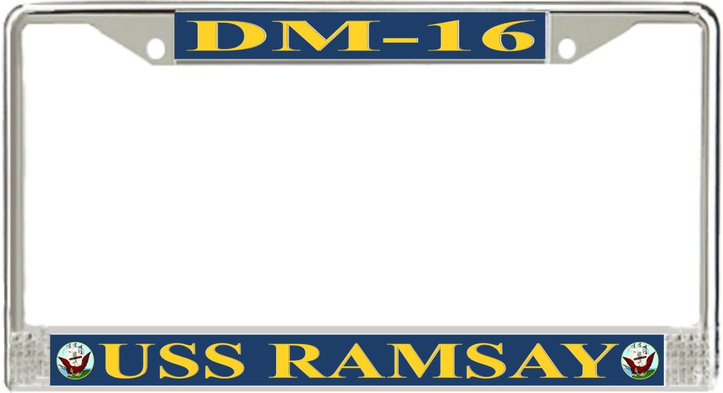 USS Ramsay DM-16 License Plate FrameThis USS Ramsay DM-16 License Plate Frame is proudly made in the USA at our facilities in Scottsboro, Alabama. Each of our MilitaryBest U.S. Navy Frames feature top and bottom Poly Coated Aluminum strips that are printed using sublimation which gives these quality automobile military frames a beautiful high gloss finish.