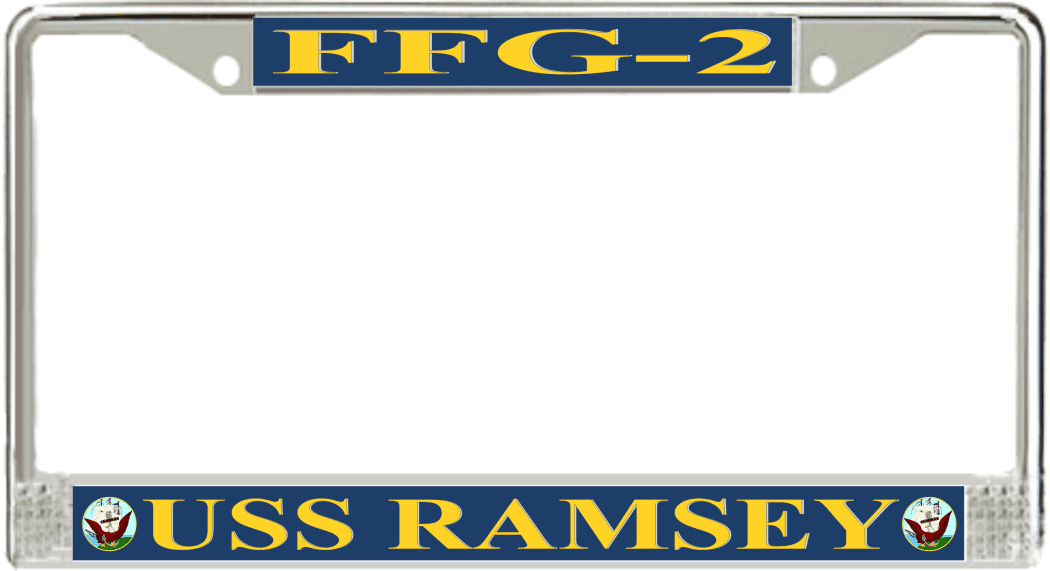 USS Ramsey FFG-2 License Plate FrameThis USS Ramsey FFG-2 License Plate Frame is proudly made in the USA at our facilities in Scottsboro, Alabama. Each of our MilitaryBest U.S. Navy Frames feature top and bottom Poly Coated Aluminum strips that are printed using sublimation which gives these quality automobile military frames a beautiful high gloss finish.