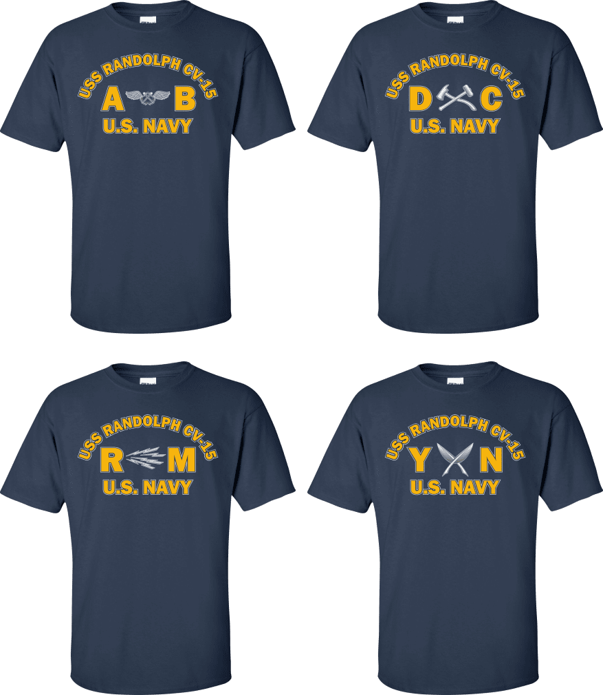 Due to disruptions in supply chains, this design will be embroidered on a Champion, Gildan, Jerzees or comparable brand.Proudly display your ship and rate with our top quality USS RANDOLPH CV-15 Rates t-shirts, sweatshirts, and hoodies. These fine U.S. Navy apparel items will make you the envy of your veteran buddies, or will make a fine gift! Our USS RANDOLPH CV-15 shirts are proudly printed in the USA!