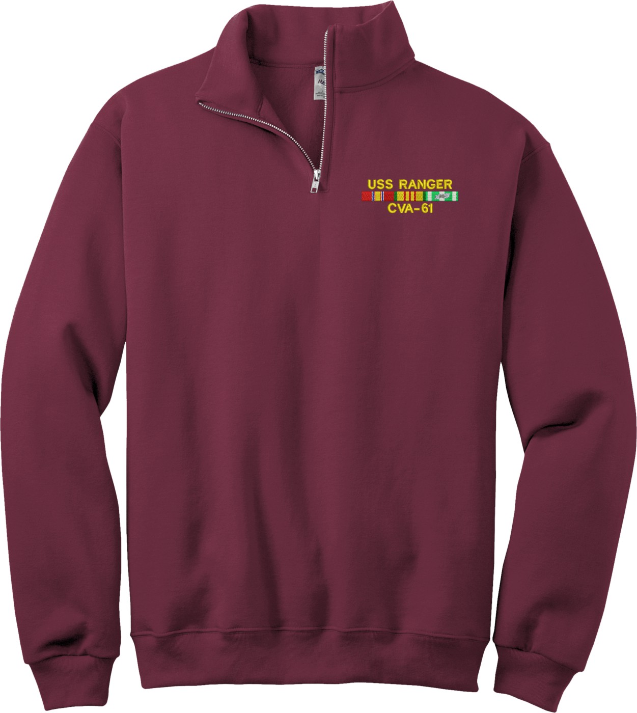 MilitaryBest is proud to offer this USS Ranger CVA-61 with Vietnam Service Ribbons Quarter-Zip Pullover. This quality shirt is embroidered by our MilitaryBest team in Northeast Alabama.PRODUCT FEATURES
