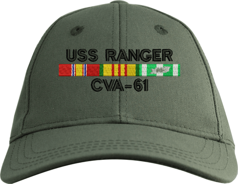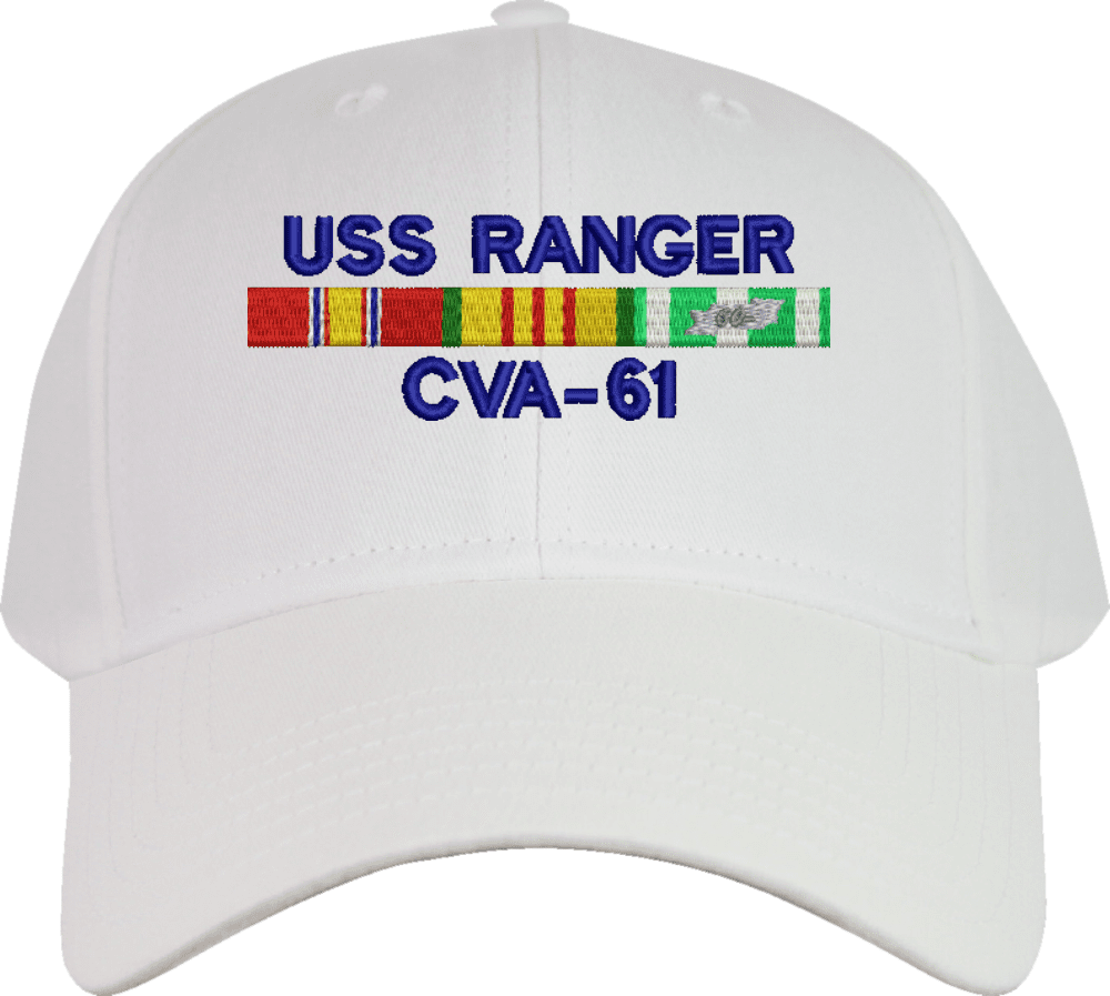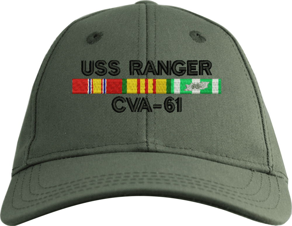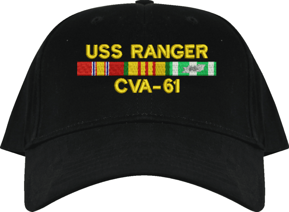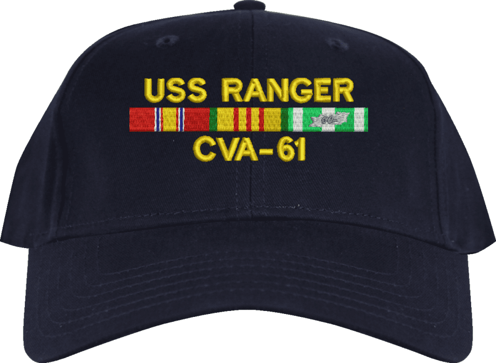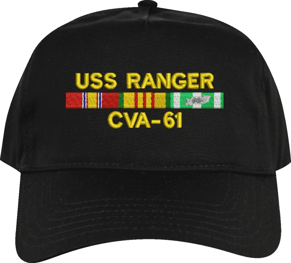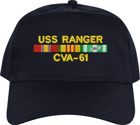 MilitaryBest is proud to offer this USS Ranger CVA-61 with Vietnam Service Ribbons Embroidered Cap. This cap is available in a 5 panel high profile or 6 panel low profile styling. All our caps are made from top quality materials. This cap would make a wonderful addition to your collection or a great gift! All custom embroidery is done at our facility in Scottsboro, AL. *Caps ordered with embroidered back text requires an additional 1 to 2 days of production time. All personalized caps will be embroidered in ALL CAPITAL LETTERS. Caps personalized with back text are not returnable unless there is a material defect in the cap.A percentage of the sale of each MilitaryBest item is forwarded to the licensing departments of each respective branch of service in support of the MWR (Morale, Welfare, & Recreation) program. These payments are made by either ALL4U LLC or the wholesaler from where the item originated. Our team thanks you for your service and your support of these programs.