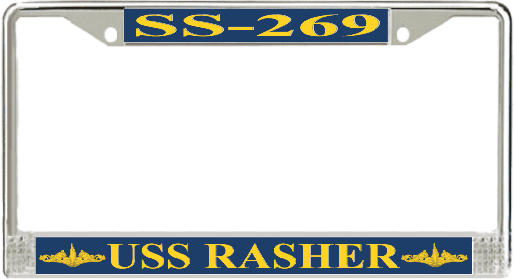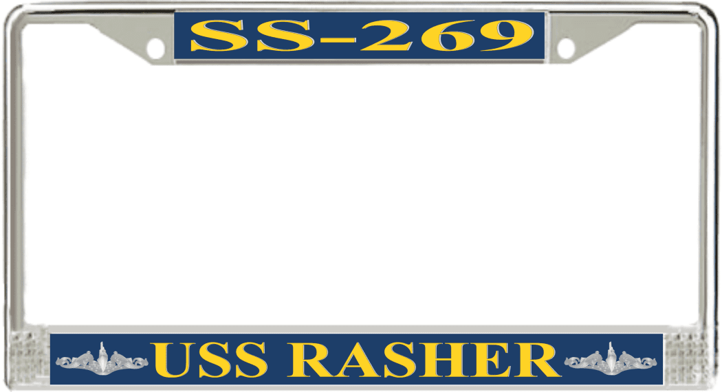 USS Rasher SS-269 License Plate Frame This USS Rasher SS-269 License Plate Frame is proudly made in the USA at our facilities in Scottsboro, Alabama. Each Frame features top and bottom sublimated design strips that are poly coated for a protective gloss finish. Please check your state and local regulations for compatibility of these frames for use on your vehicle.