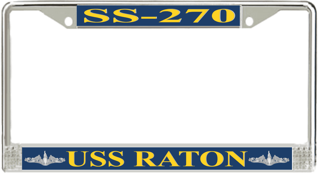 USS Raton SS-270 License Plate Frame This USS Raton SS-270 License Plate Frame is proudly made in the USA at our facilities in Scottsboro, Alabama. Each Frame features top and bottom sublimated design strips that are poly coated for a protective gloss finish. Please check your state and local regulations for compatibility of these frames for use on your vehicle.