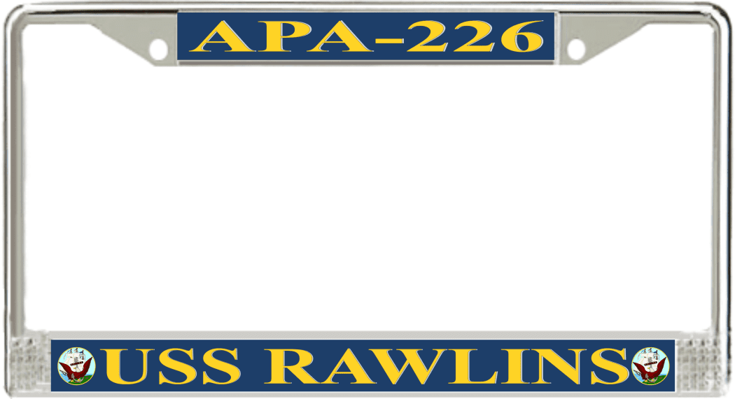 USS Rawlins APA-226 License Plate FrameThis USS Rawlins APA-226 License Plate Frame is proudly made in the USA at our facilities in Scottsboro, Alabama. Each of our MilitaryBest U.S. Navy Frames feature top and bottom Poly Coated Aluminum strips that are printed using sublimation which gives these quality automobile military frames a beautiful high gloss finish.