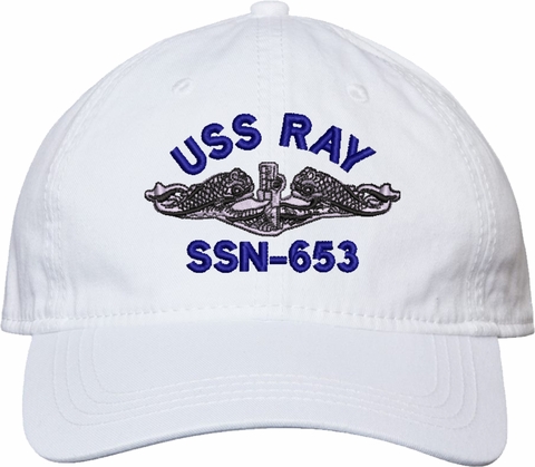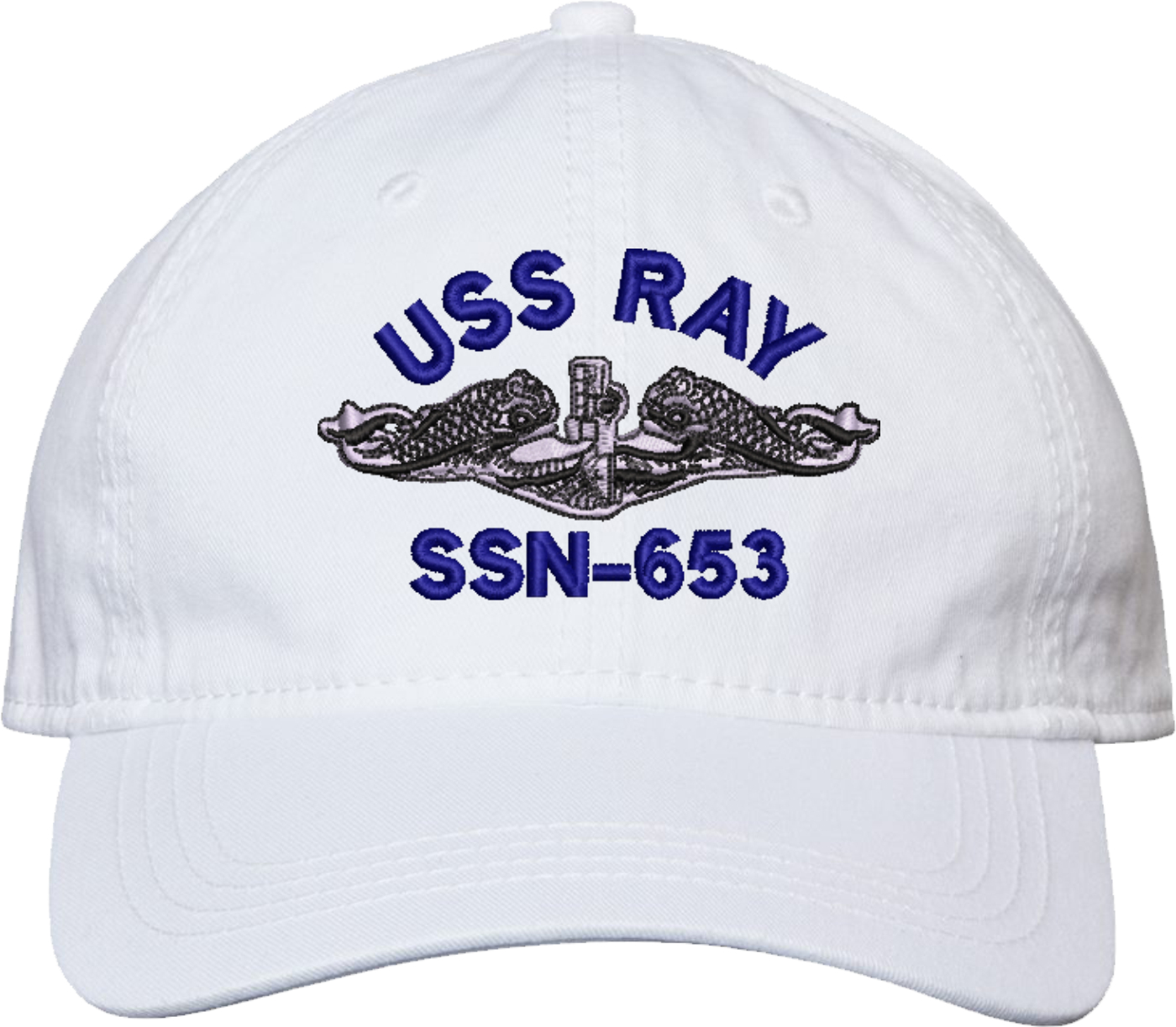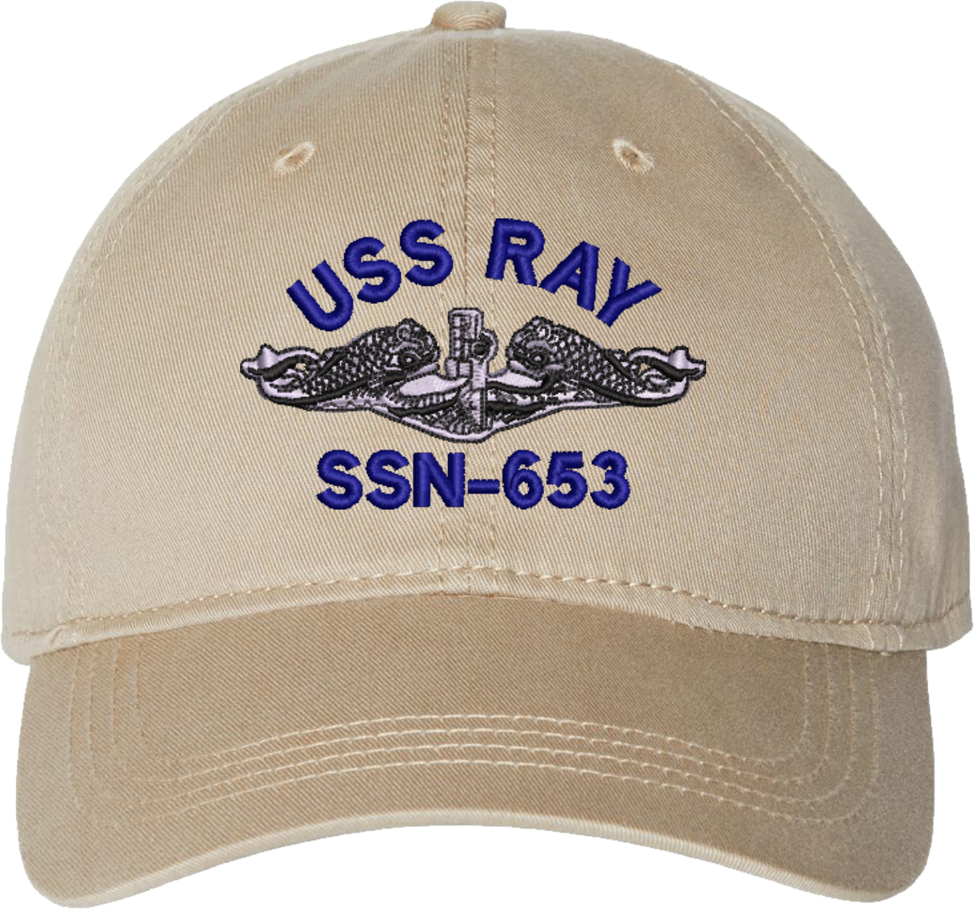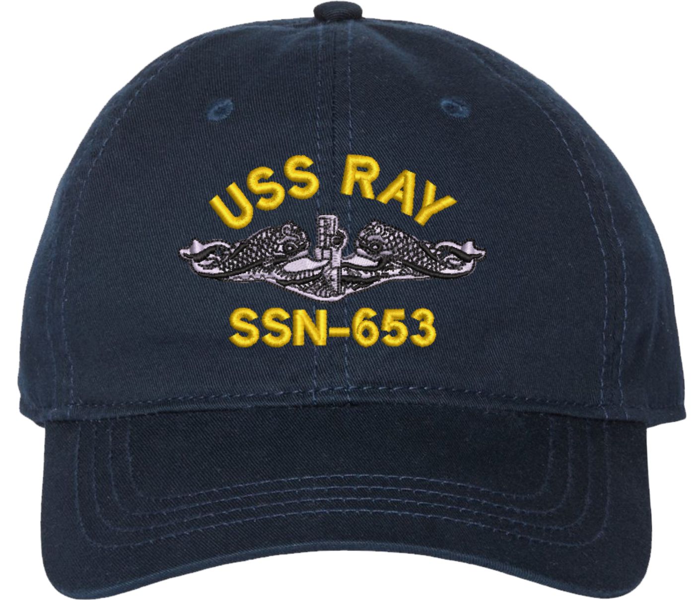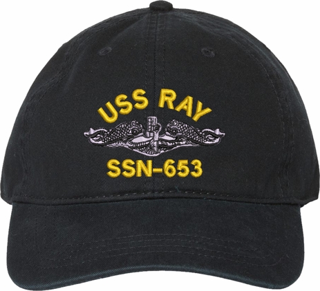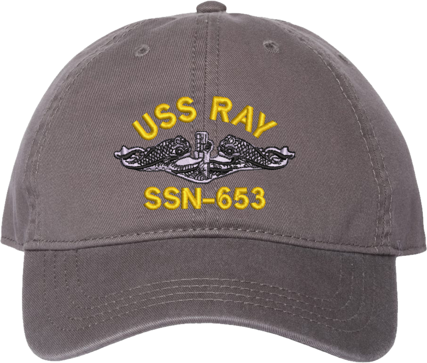 Show your Navy pride with this USS Ray SSN-653 with Dolphins Unstructured Dad Cap from MilitaryBest. Crafted from 100% washed chino twill cotton, this six-panel, low-profile cap offers a relaxed and comfortable fit. Featuring high-quality embroidery done in our Scottsboro, Alabama facility, this cap is designed with a pre-curved visor and an adjustable tri-glide buckle closure for a perfect fit. Whether for everyday wear or as a meaningful gift, this cap is a great way to honor your own or a loved one's service.For caps ordered with custom embroidered personalized text please allow an additional 3 to 5 days production time. All custom back text will be embroidered in ALL CAPITAL LETTERS. Caps with back text or eggs are non-returnable unless there is a material defect in the cap.