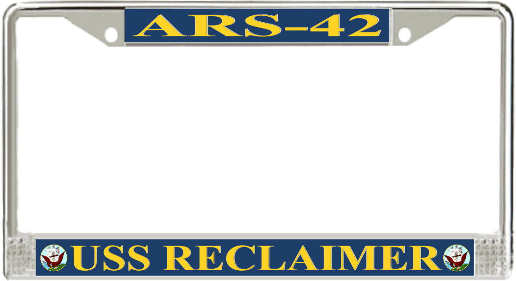 USS Reclaimer ARS-42 License Plate FrameThis USS Reclaimer ARS-42 License Plate Frame is proudly made in the USA at our facilities in Scottsboro, Alabama. Each of our MilitaryBest U.S. Navy Frames feature top and bottom Poly Coated Aluminum strips that are printed using sublimation which gives these quality automobile military frames a beautiful high gloss finish.