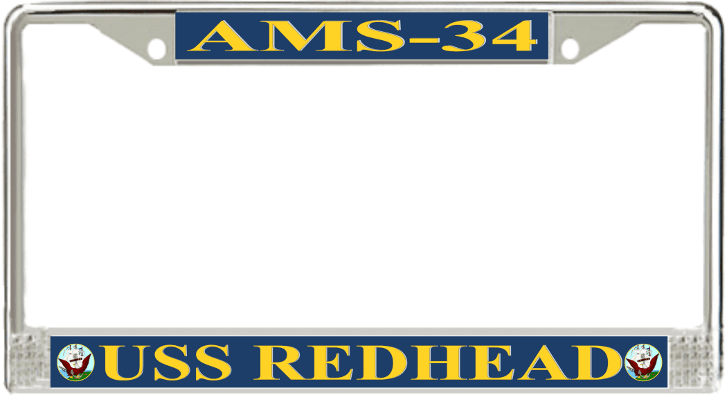 USS Redhead AMS-34 License Plate Frame This USS Redhead AMS-34 License Plate Frame is proudly made in the USA at our facilities in Scottsboro, Alabama. Each Frame features top and bottom sublimated design strips that are poly coated for a protective gloss finish. Please check your state and local regulations for compatibility of these frames for use on your vehicle.