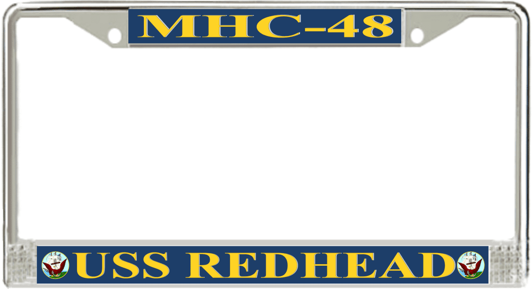 USS Redhead MHC-48 License Plate FrameThis USS Redhead MHC-48 License Plate Frame is proudly made in the USA at our facilities in Scottsboro, Alabama. Each of our MilitaryBest U.S. Navy Frames feature top and bottom Poly Coated Aluminum strips that are printed using sublimation which gives these quality automobile military frames a beautiful high gloss finish.