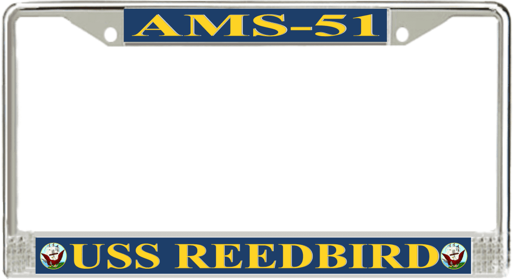 USS Reedbird AMS-51 License Plate Frame This USS Reedbird AMS-51 License Plate Frame is proudly made in the USA at our facilities in Scottsboro, Alabama. Each Frame features top and bottom sublimated design strips that are poly coated for a protective gloss finish. Please check your state and local regulations for compatibility of these frames for use on your vehicle.