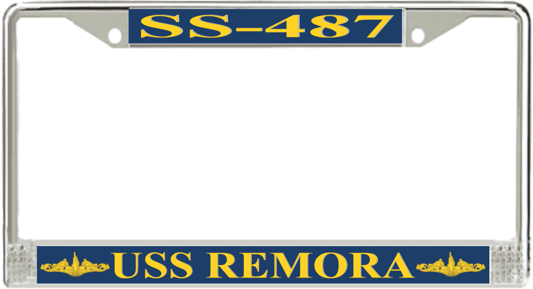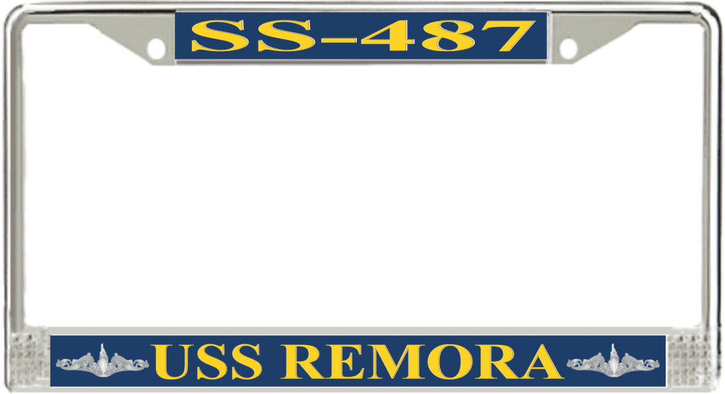 USS Remora SS-487 License Plate Frame This USS Remora SS-487 License Plate Frame is proudly made in the USA at our facilities in Scottsboro, Alabama. Each Frame features top and bottom sublimated design strips that are poly coated for a protective gloss finish. Please check your state and local regulations for compatibility of these frames for use on your vehicle.