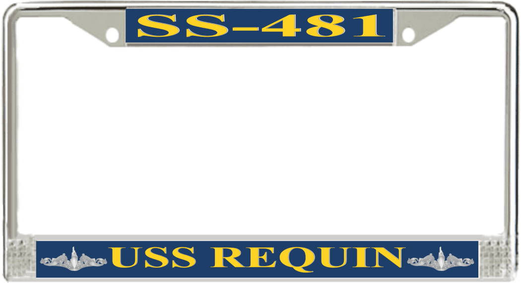 USS Requin SS-481 License Plate Frame This USS Requin SS-481 License Plate Frame is proudly made in the USA at our facilities in Scottsboro, Alabama. Each Frame features top and bottom sublimated design strips that are poly coated for a protective gloss finish. Please check your state and local regulations for compatibility of these frames for use on your vehicle.