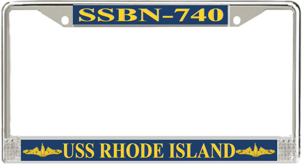 USS Rhode Island SSBN-740 License Plate Frame This USS Rhode Island SSBN-740 License Plate Frame is proudly made in the USA at our facilities in Scottsboro, Alabama. Each Frame features top and bottom sublimated design strips that are poly coated for a protective gloss finish. Please check your state and local regulations for compatibility of these frames for use on your vehicle.