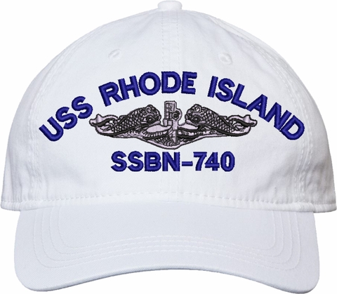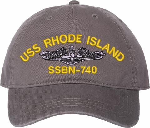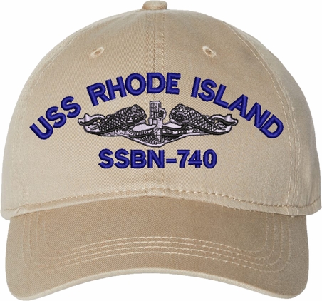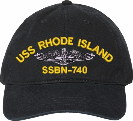 Show your Navy pride with this USS Rhode Island SSBN-740 with Dolphins Unstructured Dad Cap from MilitaryBest. Crafted from 100% washed chino twill cotton, this six-panel, low-profile cap offers a relaxed and comfortable fit. Featuring high-quality embroidery done in our Scottsboro, Alabama facility, this cap is designed with a pre-curved visor and an adjustable tri-glide buckle closure for a perfect fit. Whether for everyday wear or as a meaningful gift, this cap is a great way to honor your own or a loved one's service.For caps ordered with custom embroidered personalized text please allow an additional 3 to 5 days production time. All custom back text will be embroidered in ALL CAPITAL LETTERS. Caps with back text or eggs are non-returnable unless there is a material defect in the cap.