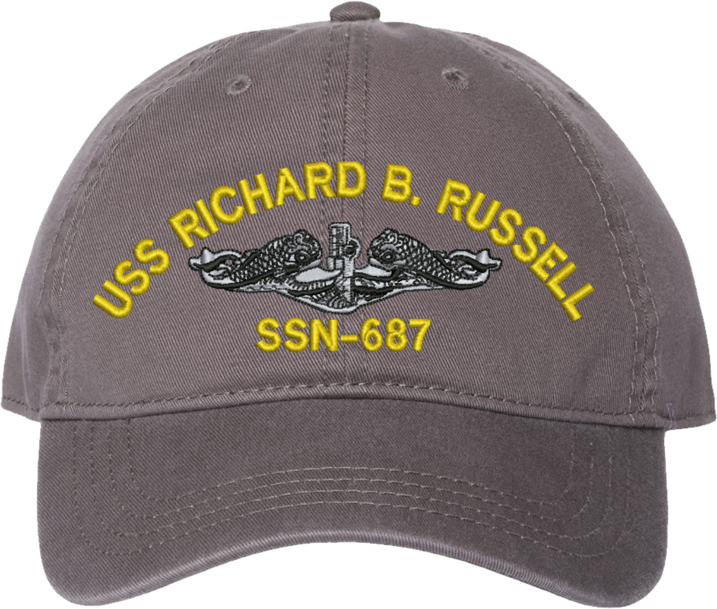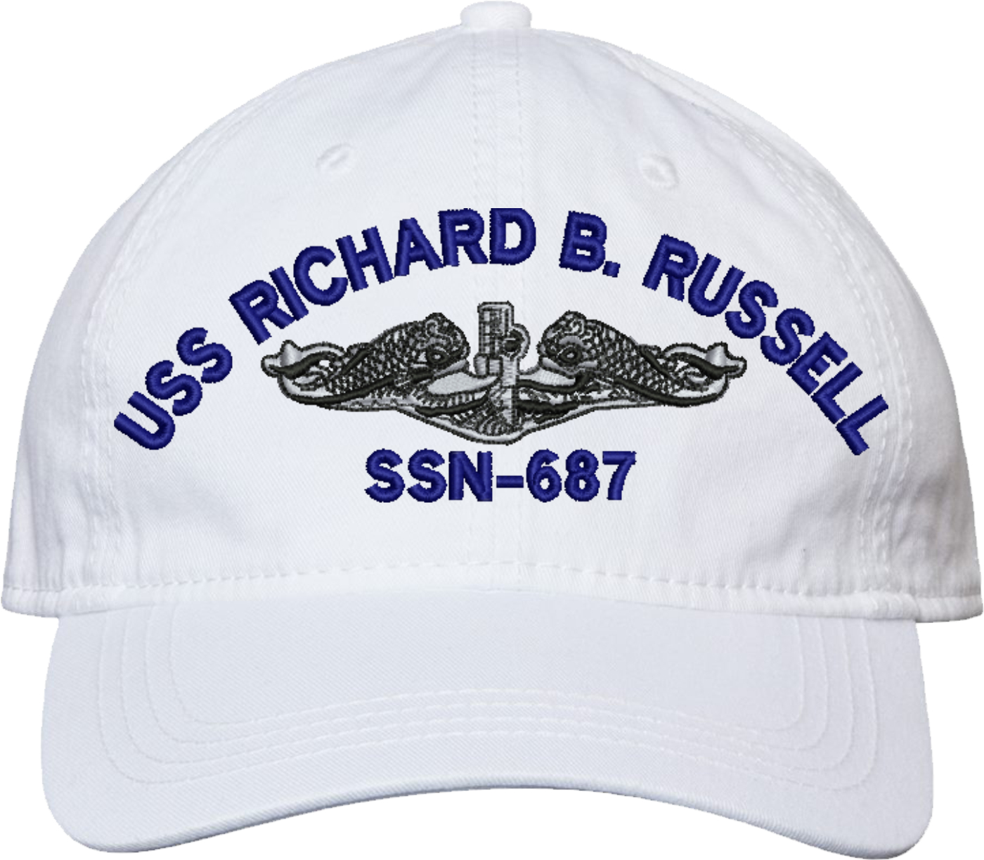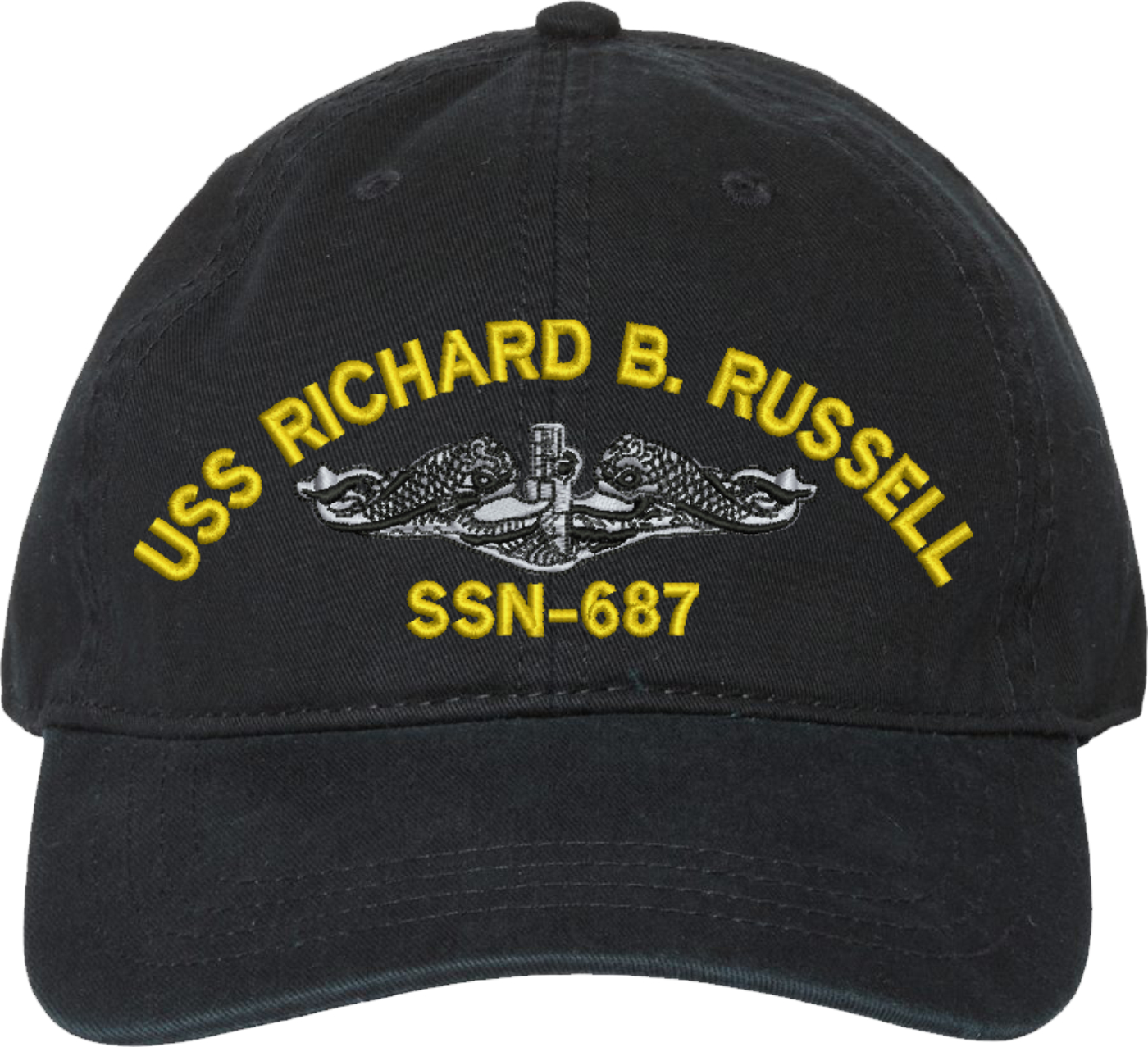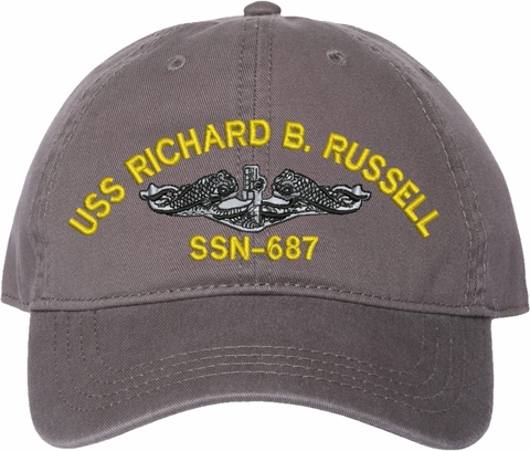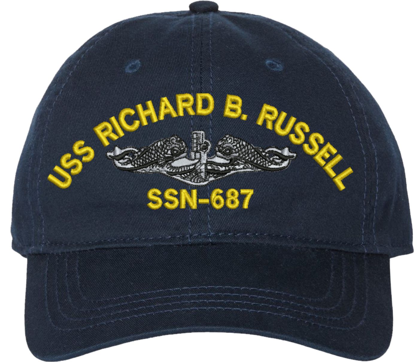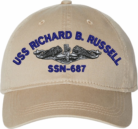 Show your Navy pride with this USS Richard B Russel SSN-687 with Dolphins Unstructured Dad Cap from MilitaryBest. Crafted from 100% washed chino twill cotton, this six-panel, low-profile cap offers a relaxed and comfortable fit. Featuring high-quality embroidery done in our Scottsboro, Alabama facility, this cap is designed with a pre-curved visor and an adjustable tri-glide buckle closure for a perfect fit. Whether for everyday wear or as a meaningful gift, this cap is a great way to honor your own or a loved one's service.For caps ordered with custom embroidered personalized text please allow an additional 3 to 5 days production time. All custom back text will be embroidered in ALL CAPITAL LETTERS. Caps with back text or eggs are non-returnable unless there is a material defect in the cap.