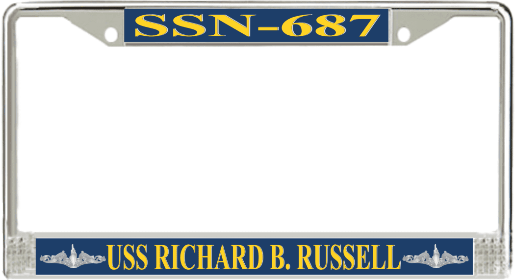USS Richard B. Russell SSN-687 License Plate Frame This USS Richard B. Russell SSN-687 License Plate Frame is proudly made in the USA at our facilities in Scottsboro, Alabama. Each Frame features top and bottom sublimated design strips that are poly coated for a protective gloss finish. Please check your state and local regulations for compatibility of these frames for use on your vehicle.
