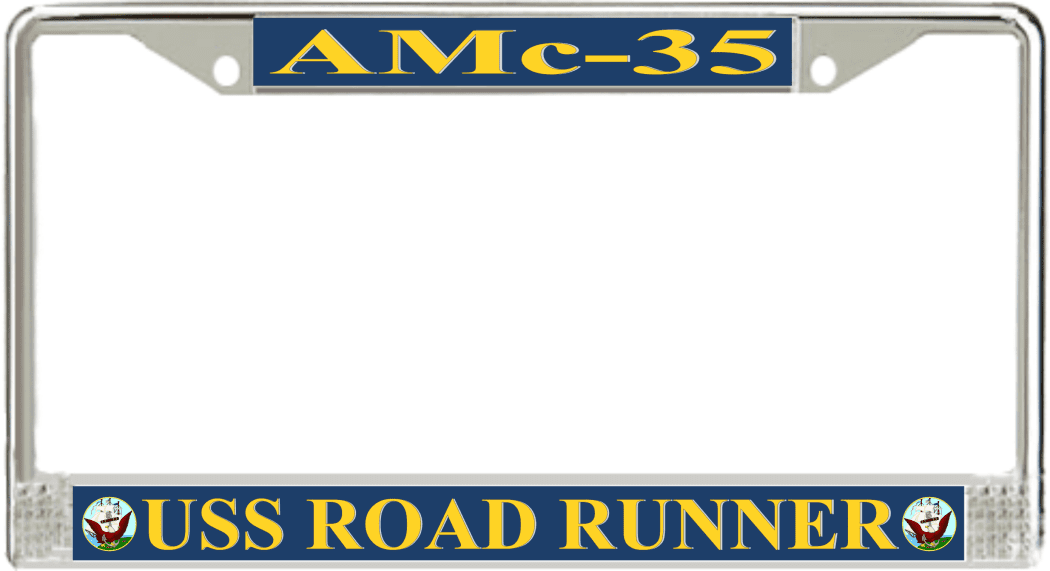 USS Road Runner AMc-35 License Plate FrameThis USS Road Runner AMc-35 License Plate Frame is proudly made in the USA at our facilities in Scottsboro, Alabama. Each of our MilitaryBest U.S. Navy Frames feature top and bottom Poly Coated Aluminum strips that are printed using sublimation which gives these quality automobile military frames a beautiful high gloss finish.