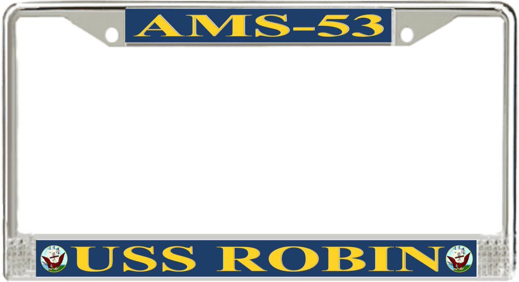 USS Robin AMS-53 License Plate Frame This USS Robin AMS-53 License Plate Frame is proudly made in the USA at our facilities in Scottsboro, Alabama. Each Frame features top and bottom sublimated design strips that are poly coated for a protective gloss finish. Please check your state and local regulations for compatibility of these frames for use on your vehicle.