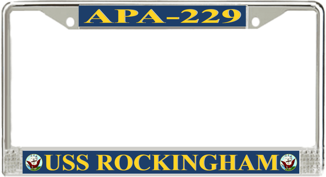 USS Rockingham APA-229 License Plate FrameThis USS Rockingham APA-229 License Plate Frame is proudly made in the USA at our facilities in Scottsboro, Alabama. Each of our MilitaryBest U.S. Navy Frames feature top and bottom Poly Coated Aluminum strips that are printed using sublimation which gives these quality automobile military frames a beautiful high gloss finish.