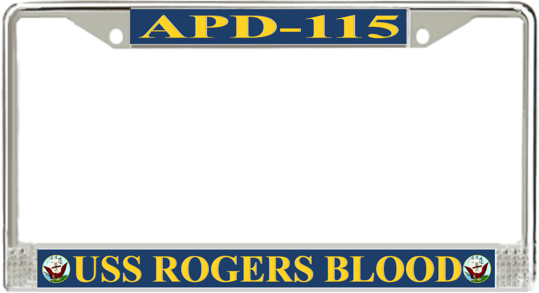 USS Rogers Blood APD-115 License Plate FrameThis USS Rogers Blood APD-115 License Plate Frame is proudly made in the USA at our facilities in Scottsboro, Alabama. Each of our MilitaryBest U.S. Navy Frames feature top and bottom Poly Coated Aluminum strips that are printed using sublimation which gives these quality automobile military frames a beautiful high gloss finish.
