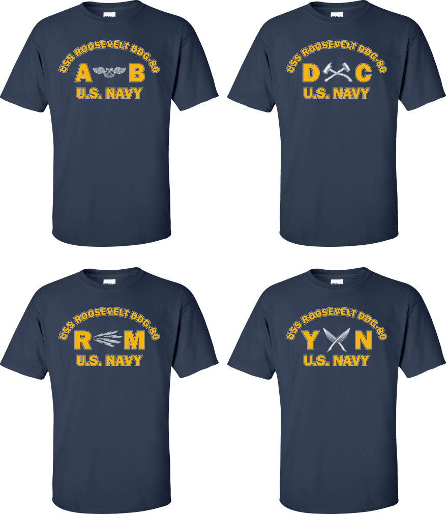 Due to disruptions in supply chains, this design will be embroidered on a Champion, Gildan, Jerzees or comparable brand.Proudly display your ship and rate with our top quality USS ROOSEVELT DDG-80 Rates t-shirts, sweatshirts, and hoodies. These fine U.S. Navy apparel items will make you the envy of your veteran buddies, or will make a fine gift! Our USS ROOSEVELT DDG-80 shirts are proudly printed in the USA!