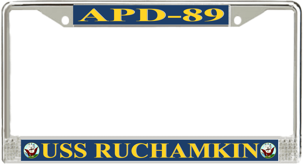 USS Ruchamkin APD-89 License Plate FrameThis USS Ruchamkin APD-89 License Plate Frame is proudly made in the USA at our facilities in Scottsboro, Alabama. Each of our MilitaryBest U.S. Navy Frames feature top and bottom Poly Coated Aluminum strips that are printed using sublimation which gives these quality automobile military frames a beautiful high gloss finish.