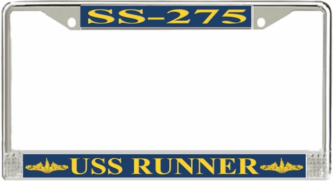 USS Runner SS-275 License Plate Frame This USS Runner SS-275 License Plate Frame is proudly made in the USA at our facilities in Scottsboro, Alabama. Each Frame features top and bottom sublimated design strips that are poly coated for a protective gloss finish. Please check your state and local regulations for compatibility of these frames for use on your vehicle.