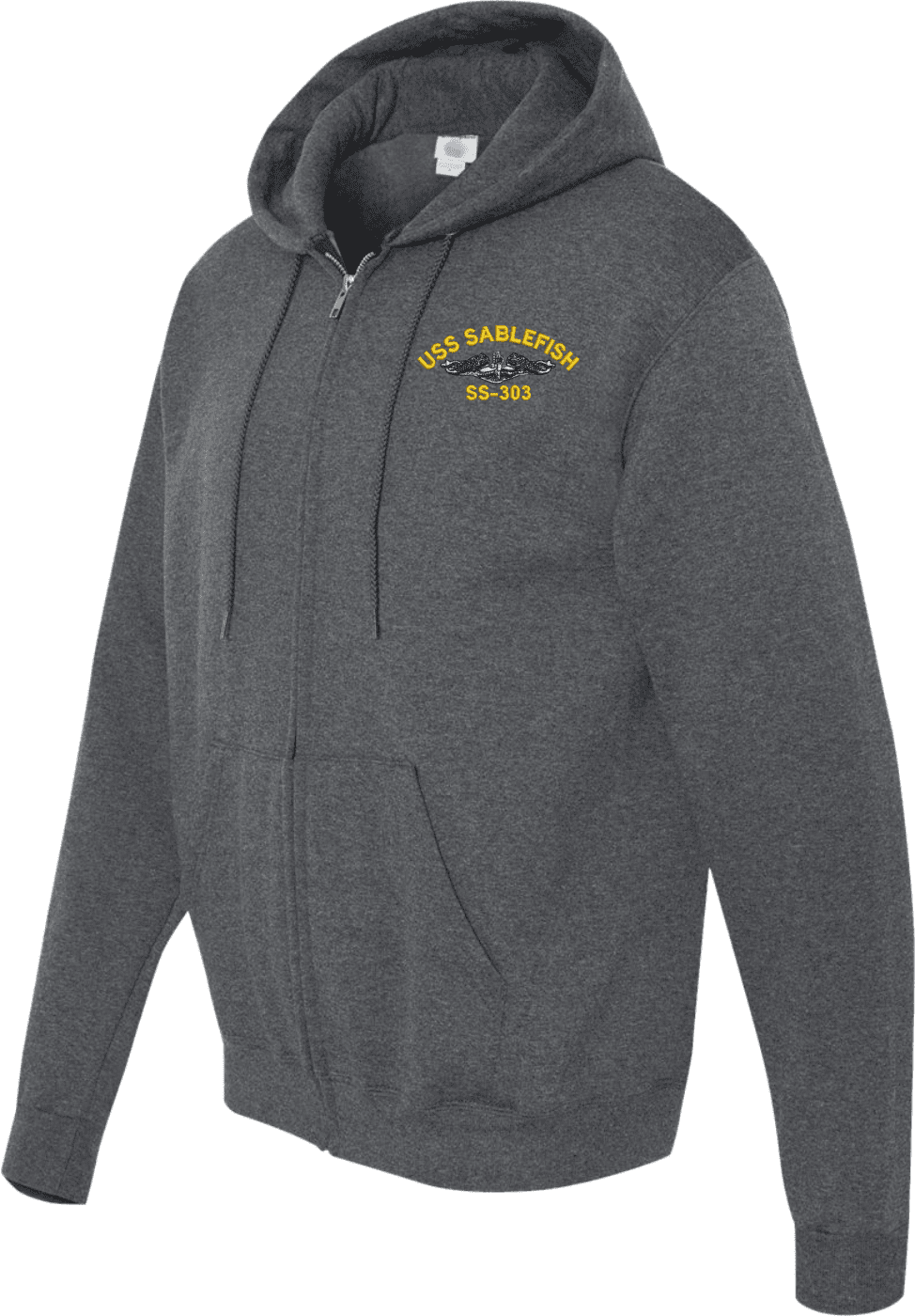 MilitaryBest has expanded its line of apparel with this custom embroidered USS Sable Fish SS-303 with Dolphins Embroidered Zippered Hoodie. Each Hoodie is direct embroidered onto a Champion brand 9.5 oz 50/50 Cotton Poly blend. This will make an excellent addition to your wardrobe, or a great gift. Your satisfaction is Guaranteed! These quality zippered hoodies are proudly embroidered at our facilities in Scottsboro, AL. Support the Army MWR program by purchasing only from Licensed Vendors.